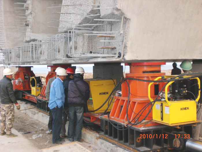 - 设备位于箱梁中间肋板处的两个大吨位顶升油缸在电脑控制下,具备长时间的恒压伺服控制,无论在箱梁顶升工况下还是在平移工况下。平移工况下即使轨道发生不平整度现象,该顶升点处的每个顶升油缸均能全程恒定提供预先设定的320吨恒定力(该数值可根据需要设定),以平衡掉该顶升点处的肋板混凝土重量,确保箱梁中间腹板处始终处于“平衡托住”的状态。
